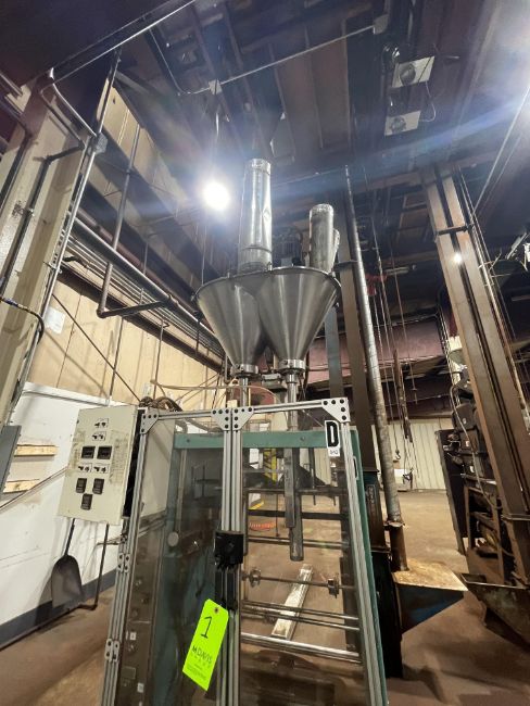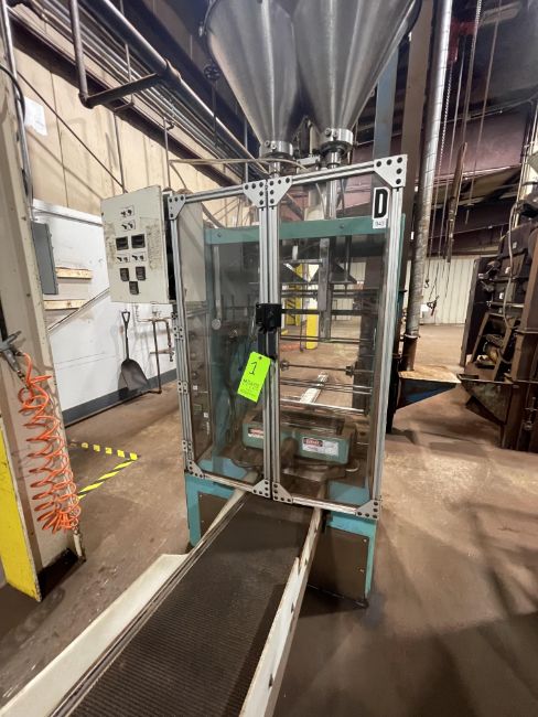 GENERAL PACKAGING EQUIPMENT COMPANY VERTICAL FORM FILL AND SEAL FILLER (VFFS), SETUP WITH (2) AUGER FILLERS, INCLINE OUTFEED BELT CONVEYOR APPROX. 12" W X 69'' L X 38'' HEIGHT, APPROX 15" SEAL BAR