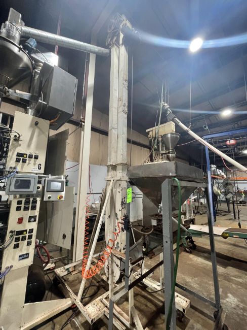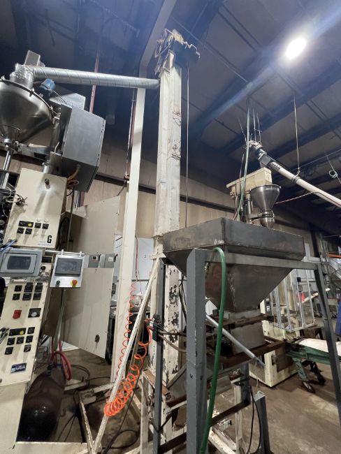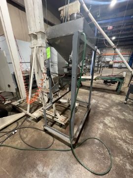 S/S PORTABLE VIBRATORY FEEDER WITH B.F. GUMP BUCKET CONVEYOR, VIBRATORY HOPPER APPROX. DIMS: 32" L X 22" W X 20" H, INCLUDES ERIEZ HI-POWER MAGNETIC SEPARATOR, PNEUMATIC GATE VALVE, APPROX. 202" TALL PORTABLE BUCKET CONVEYOR, MOUNTED ON CASTERS (PREVIOUSLY FEEDING INTO LOT 19 VFFS)
