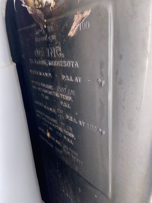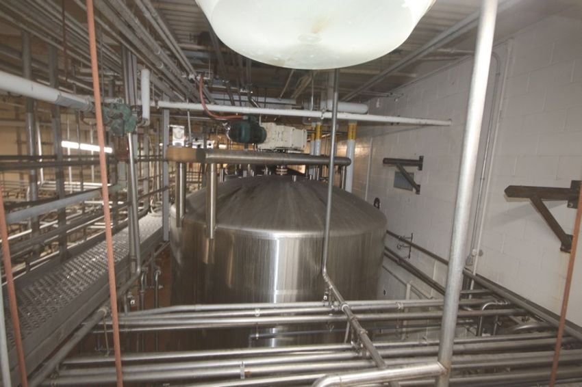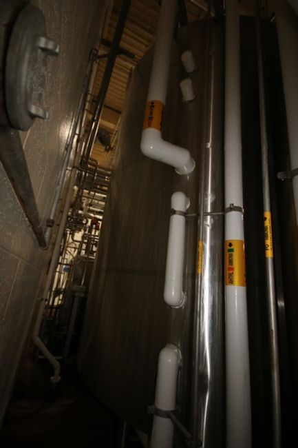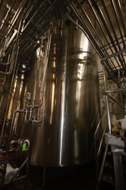 DCI 7,500 Gal. S/S Vertical Jacketed Tank, S/NJS1243B, with Top Mounted Agitation Motor & Vertical S/S Internal Tank Agitatoin, Internal Tank Dims.: Aprox. 120" Dia. x 165" Tall, Jacket Volume 22 Gal., J-MAWP 150 PSI @ 100 F, with Slopped Bottom, NAT'L BD #: 4700 (NOTE: Formerly Stored Milk Cream)(INV#81316)(LOCATED IN CHAMPAIGN, IL) (Handling, Loading & Site Management Fee: $30,000)