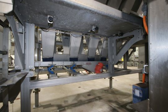 12-Station Rotary Air Lock System, with S/S Discharge Trough & Chutes, Overall Length of Unit: Aprox. 30 ft. L, with (2) Baldor S/S Clad Drives (LOCATED IN SAHUARITA, AZ) (RIGGING, LOADING, & SITE MANAGEMENT FEE: $650.00 USD)