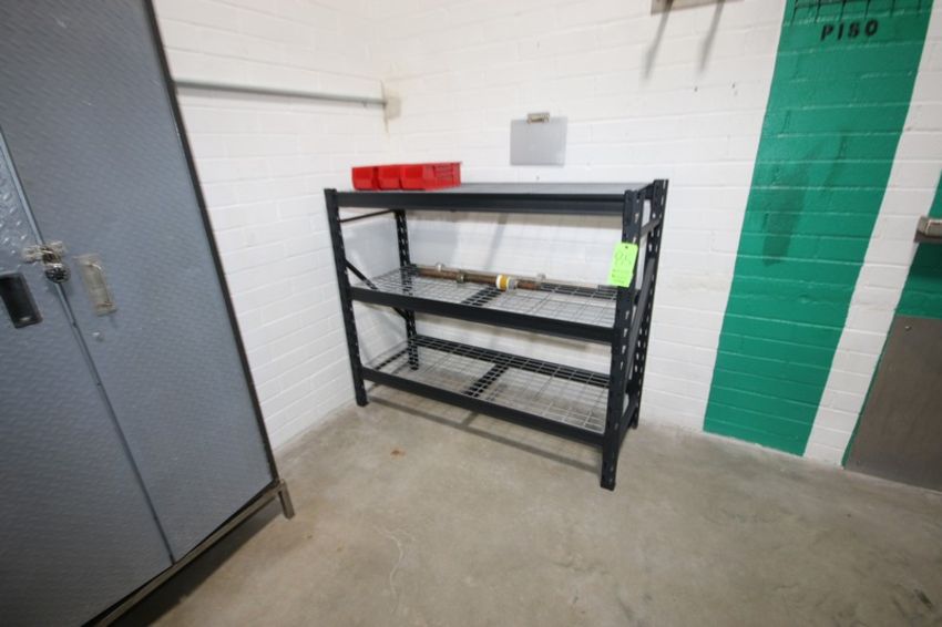 Lot of (2) Shelving Unites, 1-Unit (4) Shelves with Uprights & Cross Beams, & 1-Unit (3) Shelves with Uprights & Cross Beams, with (1) Gladiator Double Door Vertical Cabinet (LOCATED IN SAHUARITA, AZ) (RIGGING, LOADING, & SITE MANAGEMENT FEE: $100.00 USD)