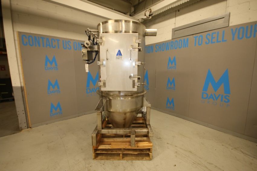 Automated Ingredient Systems Aprox. 82" H x 3' W Cone Bottom S/S Dust Collector, with (6) Cartridges, Hinged Front Door, 4" & 5" Side Connections, 12" Flanged Bottom, Bindicator, Magnehelic Gauge, Mounted on S/S Frame, (Aprox. Overall Dim. 82" H x 5' W)(INV#80971)(Located @ the MDG Auction Showroom in Pgh., PA)(Handling, Loading & Site Management Fee: $150.00)
