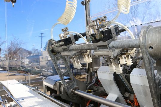 Raque S/S Tray Dispenser,2-Lanes of Aprox. 8" W Outfeed Conveyor, with 4-Head Pick N' Place Vacuum Cups, Mounted on S/S Frame (NOTE: 1-Outfeed Lane Missing Belt--See Photographs) (INV#75149) (Located @ the MDG Auction Showroom in Pittsburgh, PA)(Rigging, Loading & Site Management Fee: $200.00 USD)