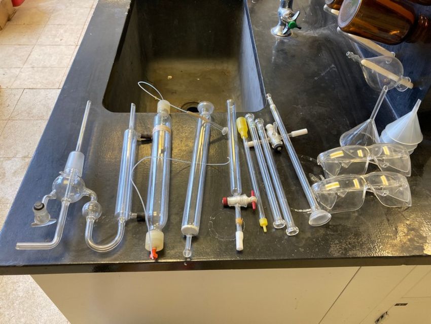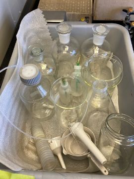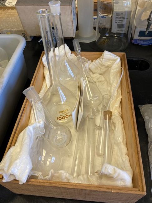 Approx 9 boxes of Lab accessories and Glassware on top of Lot 520-J: flasks, culture tubes, vial files, extraction columns, pipettes, miscellaneous glassware, mortar & pestal, glass funnels (elevator handling fee $40.00) (location New Brunswick NJ USA)
