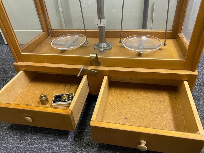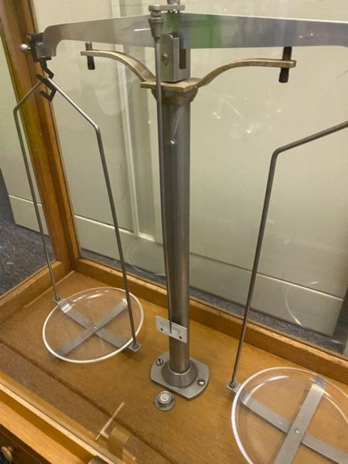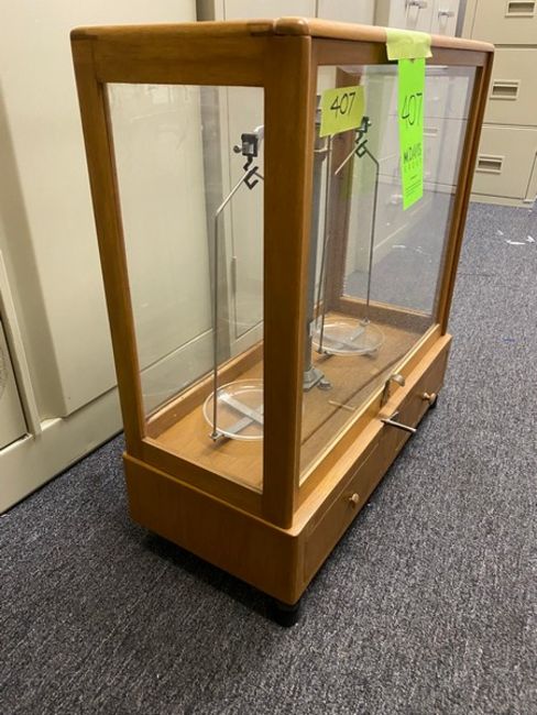 Antique Balance scale in Wood case with weights, approx size 28"WX 12"Dx24"H (Elevator Handling Fee $10) (Located New Brunswick, NJ)