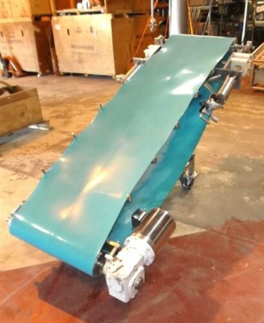 Wieland Engr. Aprox. 22" x 86" Inclined Troughing Blue Belt Sanitary Conveyor, S/N A555004, Last used in the food industry conveying cheese, Used in excellent working condition, Stainless Steel Sanitary Construction, Air cylinders tighten belt tension, 14 inch infeed x 47 inch discharge, Belt scraper under top edge, 1 / .75 hp 208-230/460 volt washdown motor, Portable on casters, Frame custom built to angle 2 inches drop to right, Will crate for 300 dollars to ship common carrier (Loading Fee $100) (Located Hortonville, WI)