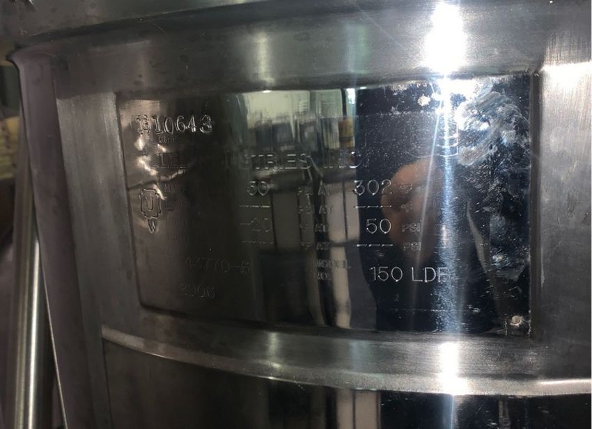 Never Used Lee Kettle 150 Liter Mirror Finished Inside (casters removed for palletizing) (LOCATED IN IOWA, Free RIGGING and Loading INCLUDED WITH SALE PRICE) -- Optional Palletizing Fee $275.00***EUSA***