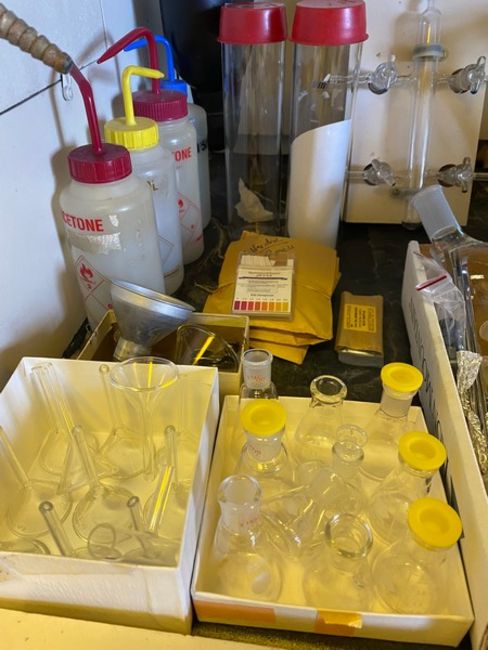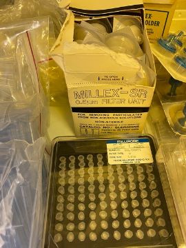Approx 8 boxes lab accessories and glassware: millipore + filters + consumables + thomas scientific / 300mm new corning condensor #2360/ glass funnels boiling + other flasks, hamilton syringes, etc, Mostly Smaller Round Bottom Flasks - 50 - 250 ml(Elevator Handling Fee $30) (Located New Brunswick, NJ)