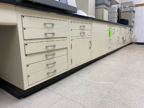 8 Lab cabinets + desk with 21'3" of black lab top / lab table & desk measure 21'3"Lx24"Dx31"H / lab table and desk have short black backsplash as seen in photos (Elevator Handling Fee $50) (Located New Brunswick, NJ)