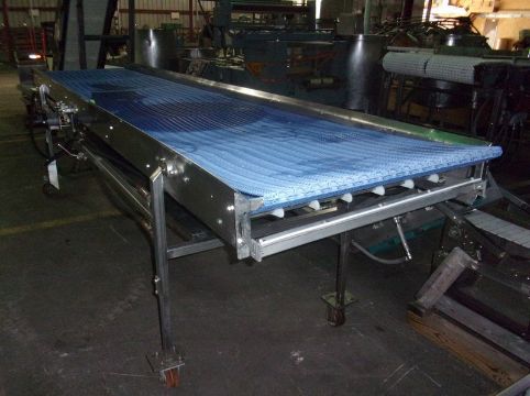 Aprox. 34" x 167" S/S Sanitary Blue Intralox Belt Conveyor, All S/S Construction, Infeed and Discharge Height Can be Changed with the Adjustable Legs, Hydraulic Driven, 2-1/2" Side Rails, Portable on Casters, Unit last used in the food industry. This item should ship via flatbed. Could possibly go common carrier if you find someone to take an item this long. (Crating and Load fee $600) (Located Hortonville, WI)