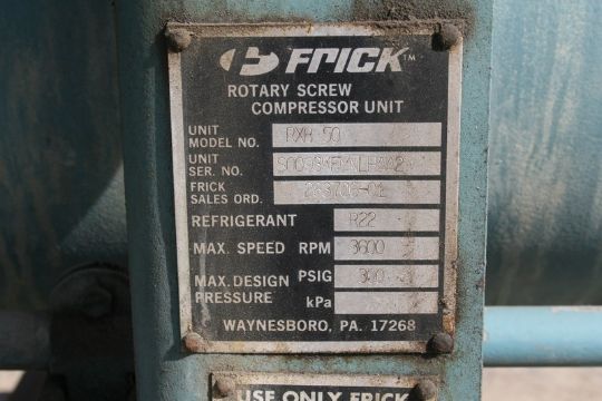 Frick 125 hp Screw Ammonia Air Compressor, Model RXB 50, S/N S0093KFMNLHAA2, RPM 3450, Volt 460, Phase 3, Max Speed 3600 RPM, 300 PSIG, R22 Refrigerant (Loading/Handling Fee $500) (Located Apollo, PA)