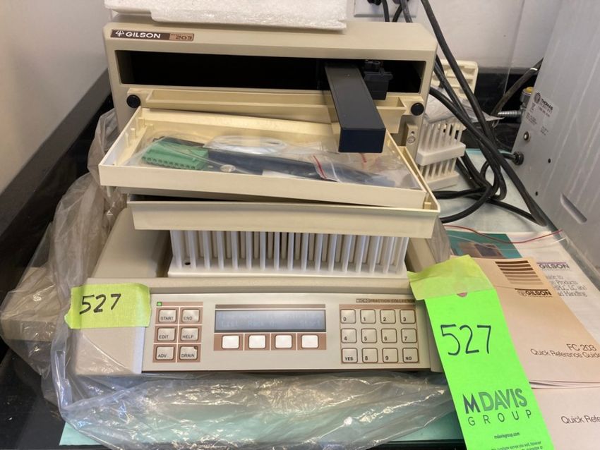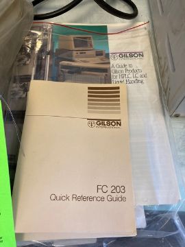 Various Lab Equipment & Glassware: Gilson Micro-Fraction Collector Model 203 with manuals - possibly unused old stock, turns on and operates (elevator handling fee $20.00) (location New Brunswick NJ USA)