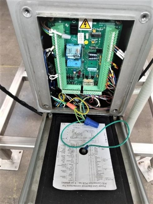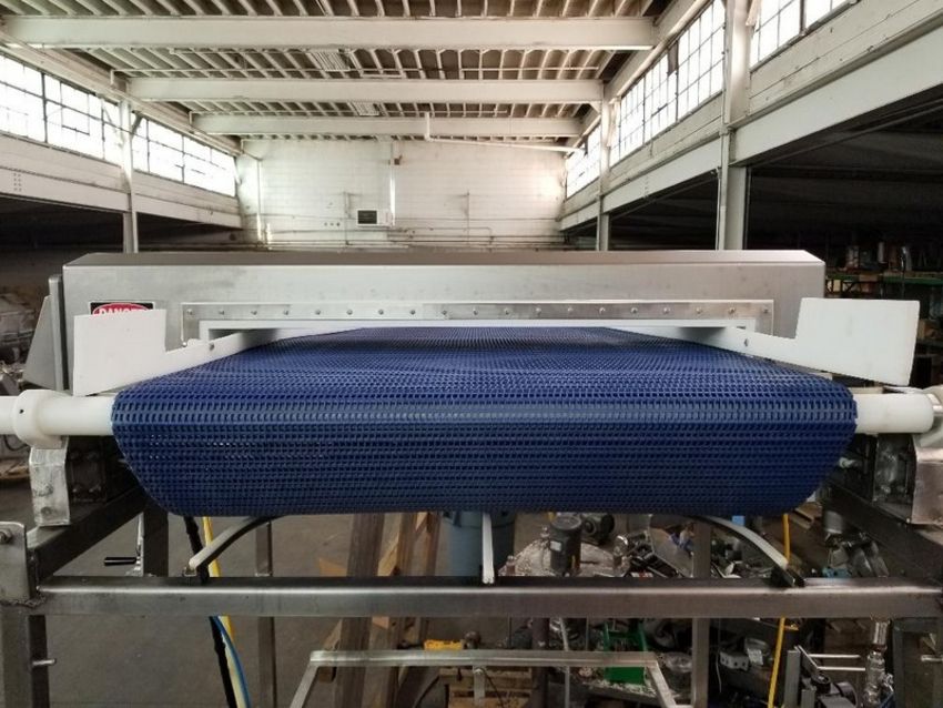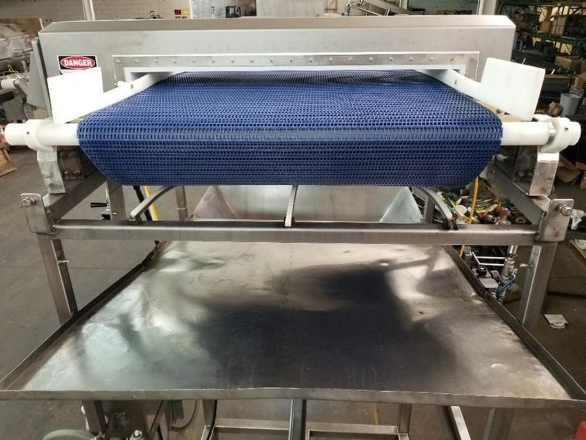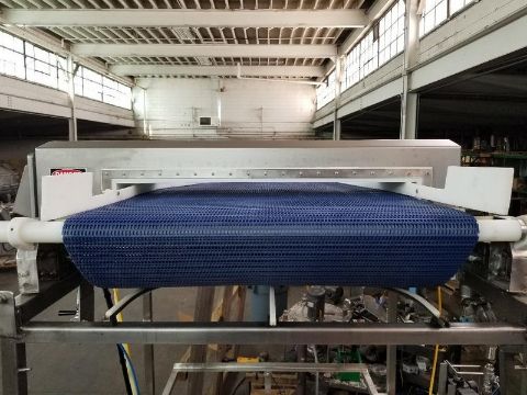 Safeline Mettler Toledo 3 x 40 S/S Sanitary Metal Detector, System was last used in a Tyson plant on breaded fish fillets coming out of a spiral freezer. Unit was just removed from service in Oct 2021. Unit is in excellent working condition. Apparature opening is 3 inches high X 40 inches wide, Product clearance is a little over 2 inches high, Belt is hydraulic driven, Automatic belt pull back reject to hopper below the system, All stainless steel sanitary construction, Overall dimensions are 106 inches high X 66 inches long X 62 inches wide, System could be lowered by 48 inches if the bottom frame with hopper was removed. (Crating and Loading Fee $750) (Located Hortonville, WI)