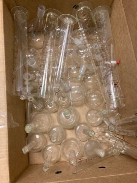 9 pieces - Misc Lab Glassware & Equipment - 3 boxes / binsMisc Lab Glassware - lab clamps, graduated cylinders, beakers, flasks with and without stoppers PLUS 3 NEW boxes Fisher Brand Disposable Culture Tubes - 125 count (25x150mm) PLUS 3 tube racks (Located New Brunswick, NJ) (Elevator Handling Fee $20)