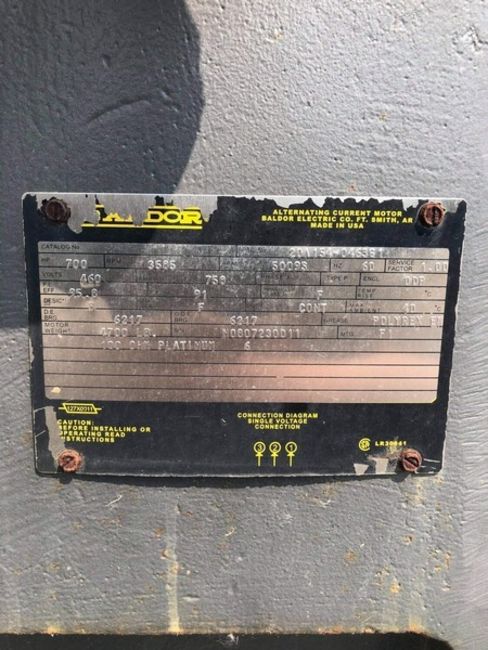 Baldor 700 hp Motor, 460 Volts, 3585 RPM, 3 Phase, Frame 5009S, Overall Dimensions Aprox. 52"L x 41"W x 28" H (Unit #3293) (Shipping Fee $350) (Located Pulaski, WI)
