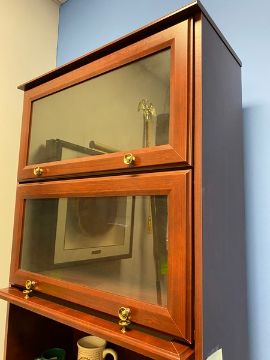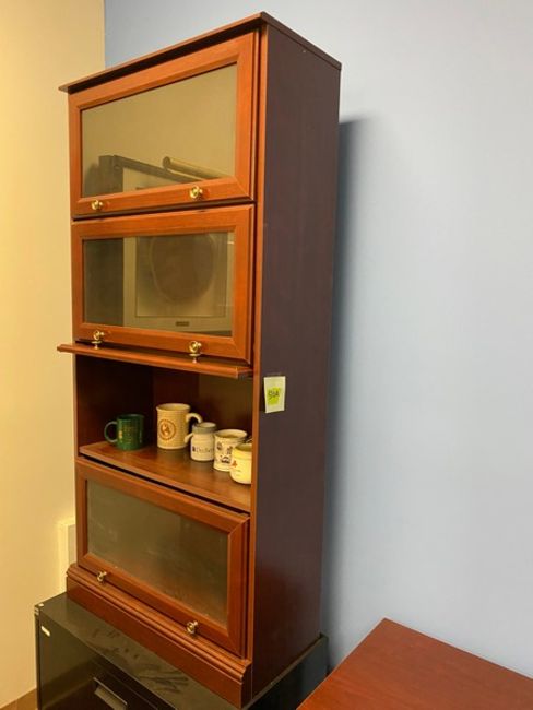3 matching pieces with contents. 2 glass door showcases (29"W x12"D x60"H) and 1 matching credenza (65.5"W x 21"D x 30"H) (Elevator Handling Fee $30) (Located New Brunswick, NJ)