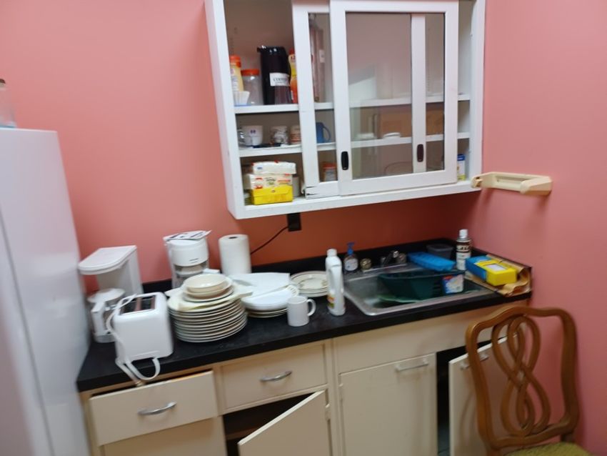 All Kitchen contents: HotPoint Double Door Refrigerator, white, 2 side-by-side doors, with ice maker and water dispenser in door 36"Wx31"Dx70"H / everything else in kitchen you can see in photos including but not limited to coffee makers + toaster + kitchen cabinets + sink + dishes and kitchen utensils (Elevator Handling Fee $30) (Located New Brunswick, NJ)