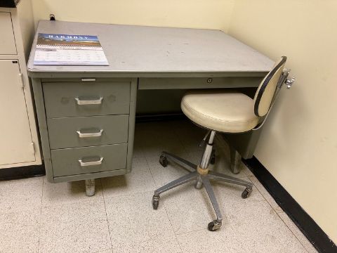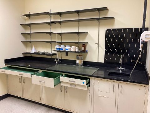 Entire Contents of Room featuring approx 21 ft of Lab Benches with stone top + sink and cabinets plus shelves + Desk and chair: one (1) lab bench with cabinets & drawers 118"Lx23"Dx38"H PLUS one(1) lab bench with sink and cabinets 129"Lx30"DX37"H PLUS wall mounted glassware drying peg system PLUS 20 individual shelves with brackets and mounting system PLUS metal desk and lab stool (elevator handling fee $100.00) (location New Brunswick NJ USA)