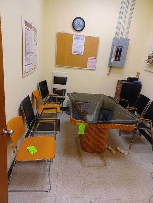 Remainder of lunch room: 6 lunchroom chairs, assorted colors, 1 bamboo base table (needs new glass top), 1 filing cabinet with 3 drawers (Elevator Handling Fee $20) (Located New Brunswick, NJ)