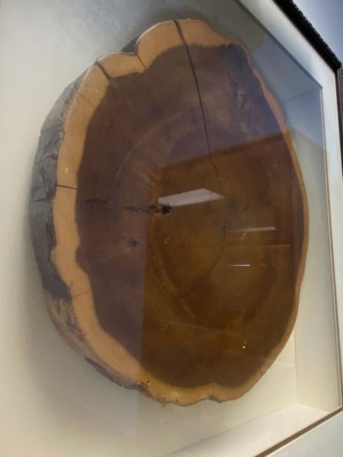 Wood Pacific Yew Trunk Section Art in Framed Window Box w/ overhead lamp. Silver plaque reads TAXUS BREVIFOLIA. 27.5"W x 5"D x 27.5"H (Hand Carry) (Located New Brunswick, NJ)