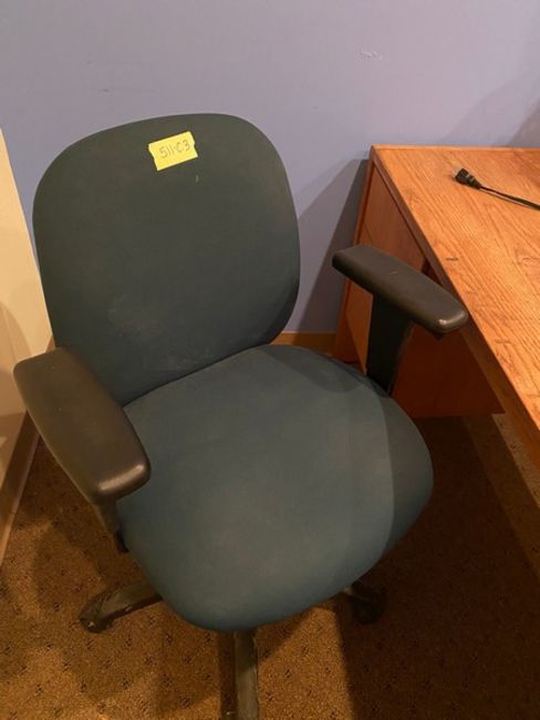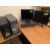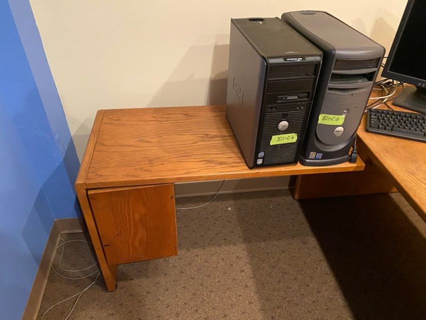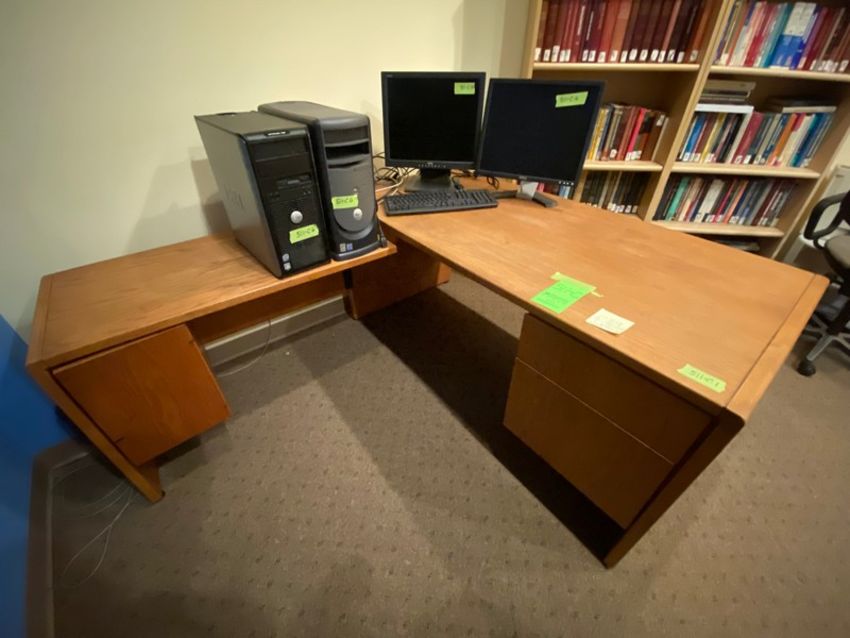 Mixed office furniture lot of 13 units total: 2 large wood desks, 2 desk chairs, 2 wood office chairs, 2 Dell computers, 2 monitors, key board, accessories /cords. Desk #1: L-shaped wooden workstation/desk with 2 drawers/1 cabinet 61"Wx29"Dx29"H. Side table (connected to desk) dimensions 41"Wx20"Dx26"H / Desk #2: Wooden desk with 4 drawers 71"Wx35"Dx29"H / Desk chair #1: light mauve/swivel on wheels / Desk chair #2: green/swivel on wheels / 2 office chairs with wooden frame and base/ tan fabric upholstery / 2 Dell computers: models Opti-Plex 755 & Dimension 4550 / Monitor #1: Ultra Sharp 16"wx13.5"H / Monitor#2: Dell 16"Wx13"H (Elevator Handling Fee $50) (Located New Brunswick, NJ)
