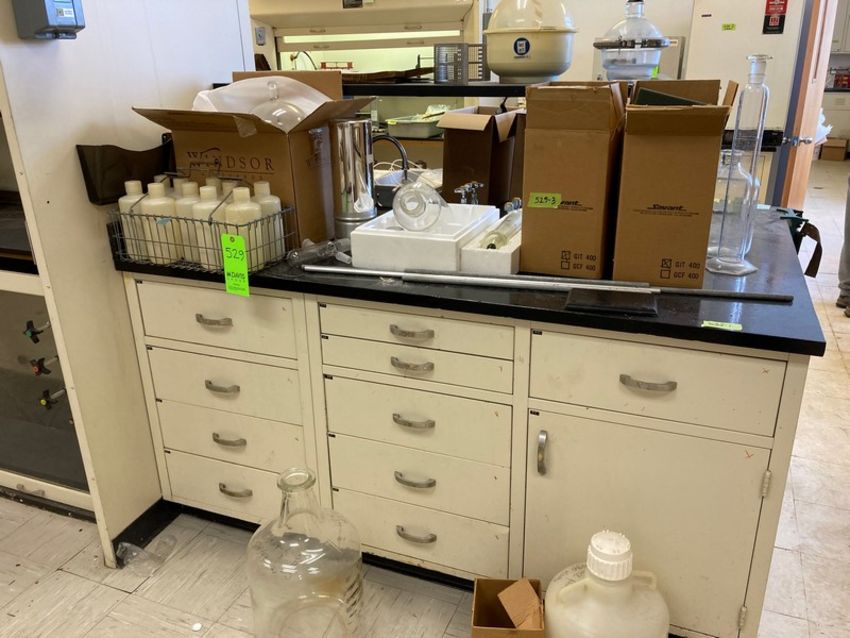 L-shaped Stone-Top center island Lab bench with 9 Base Cabinets with Approx 18 ft of worspace & upper shelf71"Lx30"Dx37"H - see rough measurements in photo (elevator handling fee $80.00) (location New Brunswick NJ USA)
