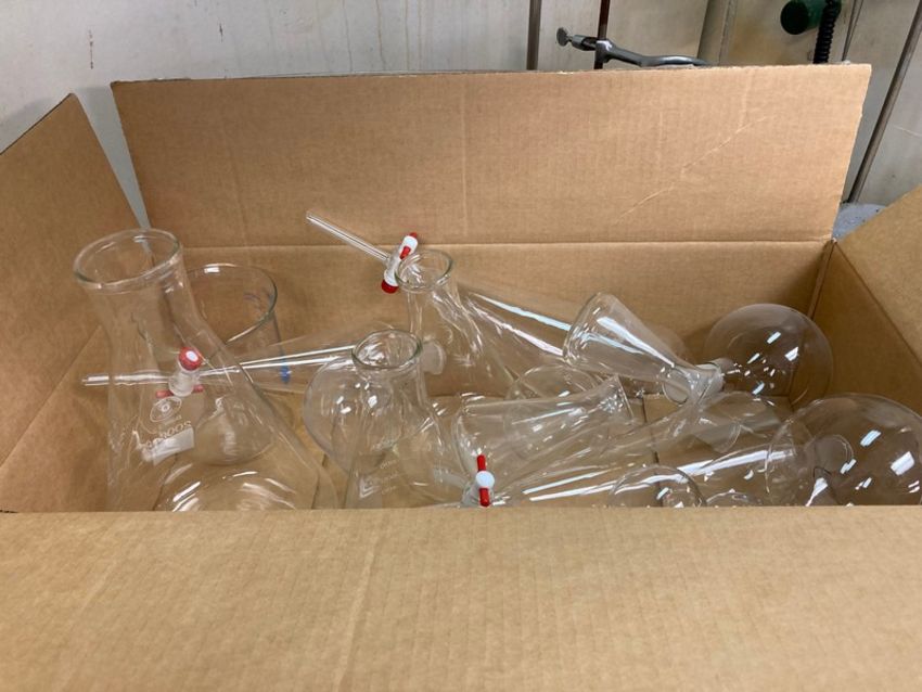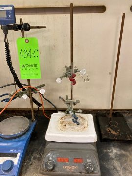 5 pieces - Lab Hot Plates / Stirrers and Misc Lab Equipment - one(1) Corning PC 4200 Sirrer & Hot plate / heating unit with clamps - working condition PLUS two(2) IKA RCT Basic hot plates / warmers with clamps & digital thermometers - one working & one needs repair,PLUS one(1) lab stand PLUS one (1) box misc lab glassware - flasks & beakers (Located New Brunswick, NJ) (Elevator Handling Fee $20)