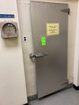 Cold Room Laboratory-Walk-In Cold Room with lab bench and sink. Room R08. Freezer Door & Room with any controls and refrigeration unit. Approx 94" x 134" x 81"H. Removed by customer. Shelving NOT included-see lot 546 (Elevator Handling Fee $100) (Location New Brunswick, NJ)