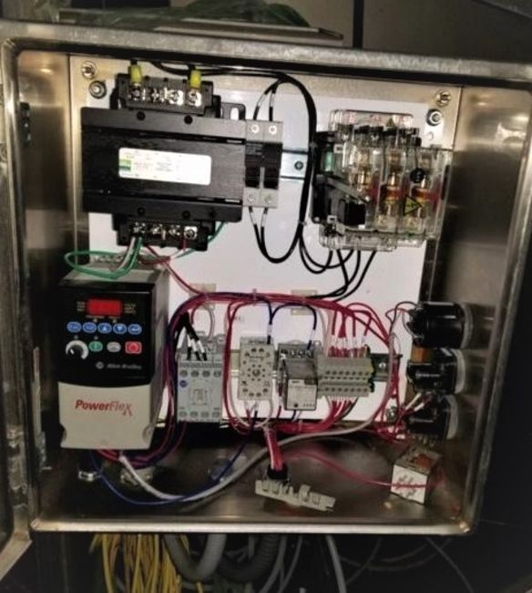 Keenline 10 Inch Wide S/S Sanitary Incline Intralox Belt Conveyor, S/N 17677SAR - Variable Speed with 90 deg exit, Last used in the food industry and remains in excellent working condition, S/S Side Rails, 90 Degree Turn at the Exit, Conveyor total overall length is 202 inches, Unit has an Allen Bradley Powerflex speed controller, .5, hp drive 230/460 volt 1725 rpm -- This conveyor has 2 control boxes as it must of been in conjunction with other pieces of equipment. As you can see from the photos of the control box along with the speed controller is other electronics. We can leave this on the unit or remove it., Current infeed height is 24 inches, Discharge height is 58 inches, These heights can be adjusted somewhat with the adjustable foot pads, This system will need to ship via flatbed due to the size, (We can assist with shipping arrangements) (Loading Fee $400) (Located Hortonville, WI)