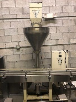 AMS Fully Automatic Filler, Model A-400E, S/N A-400171-E with Bottom Discharge Opening Measurement of 3" Dia., Conveyor Belt Aprox. 6 ft. L x 8 ft. W, Last used in one of FL is largest nutraeutical processing companies (Loading Fee $350) (Located Hialeah, FL)