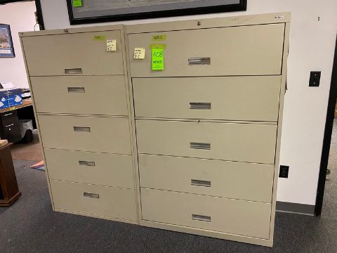 2 Metal Lateral Filing Cabinets with 5 Drawers each, one(1) with lock and key 36"Wx18"Dx64"H and one(1) with lock 42"Wx18"Dx64"H (Elevator Handling Fee $20) (Located New Brunswick, NJ)