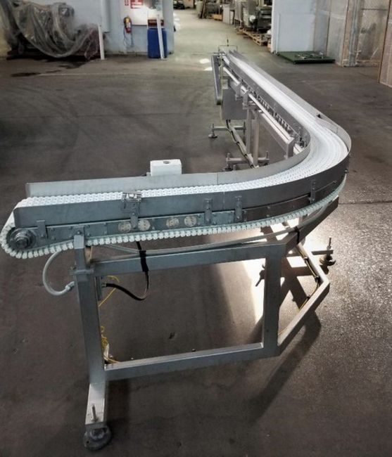 Aprox. 8" W x 16' L S/S Sanitary Intralox Conveyor with 90 Degree Turn, 1/2 hp Drive, 208/230/460 V, Electric Eye, Infeed and discharge height is 45 inches. This is adjustable with foot pads, 2 Inch siderails the entire length of the conveyor -- This system was last used in a Tyson Foods Plant and just removed from service. System is in excellent working condition. This system should ship flatbed. Not sure we can get a common carrier to take this due to the length of the unit. (Loading Fee $250) (Located Hortonville, WI)