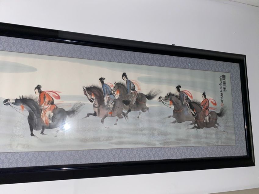 one (1) Oriental Hand-Painted Horse Artwork / picture in frame 62"Lx22"H (Hand Carry) (Located New Brunswick, NJ)
