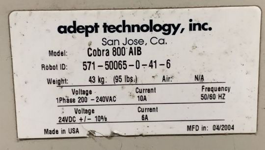 2004 Adept Pick and Place SCRA 4 Axis Style Robot, Model COBRA800A1B, 200 - 240 VAC (Unit #102) (Located New Bothwell, Manitoba Canada)