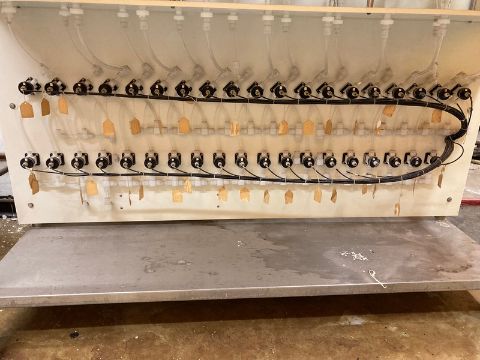 1 Oyster Bay Pump Liquid Dispensing System with 19 glass beakers on stainless steel rolling cart (elevator handling fee $30.00) (location New Brunswick NJ USA)