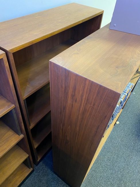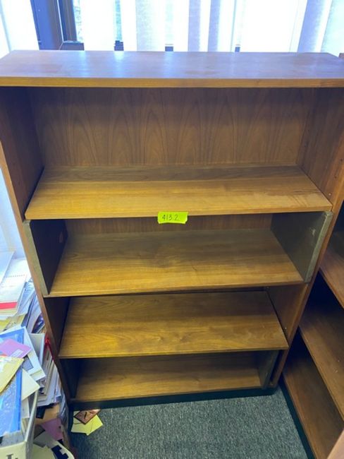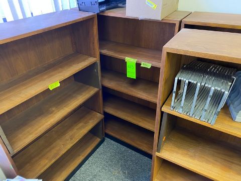 4 matching wood veneer book shelves all 36"Wx12"Dx55"H plus 12 miscellaneous desk-top file storage items (Elevator Handling Fee $40) (Located New Brunswick, NJ)