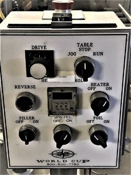 World Cup 8-Pocket Intermittent Motion S/S Rotary Cup Filler Sealer, Model 8-12 with pre-cut heat sealer. Rated from 8 to 45 cups per minute – depending on materials. Fill range: 1 oz to 10 oz. Container size up to: 3.18" in Diameter. Change parts required to accommodate other size ranges. Cup magazine with dual screw cup denester, piston filler, pre-cut foil lid magazine, Pneumatic heat sealing head and sweep arm reject. Control panel with fill, foil, heat, table and jog on / off switches. Temperature controller and e-stop. Mounted on (4) leg stainless steel base with casters. Hopper will be supplied prior to shipping. (Crating and Loading Fee $500) (Located Hortonville, WI)