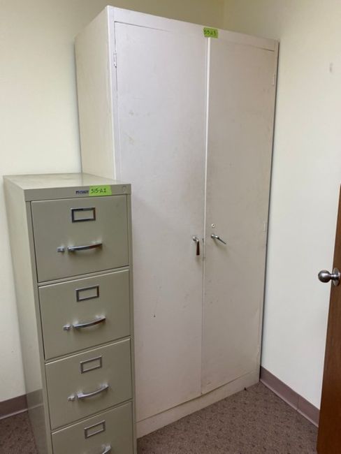 Assorted office furniture & equipment. 1 folding table 48"Lx24"Wx32"H / 4 drawer vertical filing cabinet 15"Wx15"Dx52"H / Metal storage cabinet with supplies 36"Wx18"Dx78"H / Royal Crosscut Paper Shredder 13.5"Wx9"Dx18"H (Elevator Handling Fee $30) (Located New Brunswick, NJ)