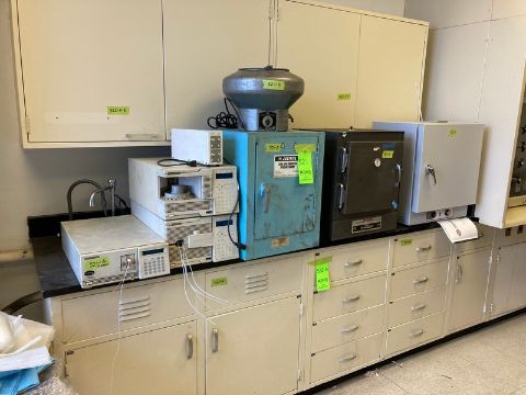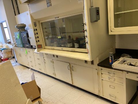 4 Lab Base cabinets & 9 ft Stone Lab Top with Sink: tabletop 100"Lx30"W; sink 17"Lx14"W / cabinets 113"Lx29"W PLUS 2 Hanging Lab Cabinets - 2 double-door cabinets each 48"Wx13"Dx31"H PLUS Airflow Supreme Fume Hood - floor to ceiling with 1 glass door and lower cabinets: 81"Wx35" H - double door + side cabinet with door and drawer (elevator handling fee $150.00) (location New Brunswick NJ USA)