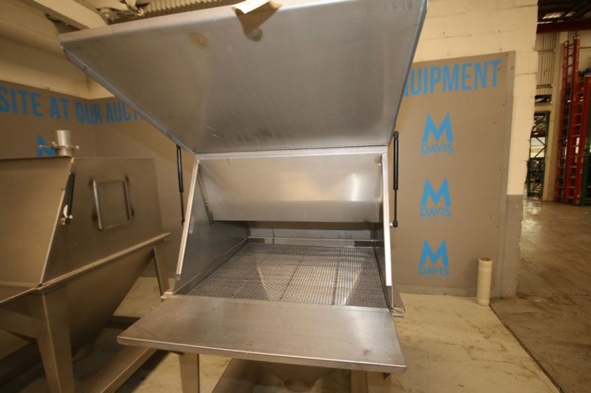 Flexicon S/S Portable Powder Dump Hopper, SN 46023, with 36" W x 36" L Interior with Hinged Lid, S/S Screen, 4" Top Connector, 8" Bottom, (Aprox. Overall Dim. 40" W x 50" L x 6' H)(INV#80968)(Located @ the MDG Auction Showroom in Pgh., PA)(Handling, Loading & Site Management Fee: $100.00)