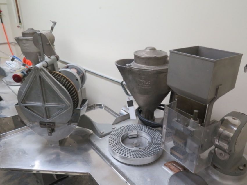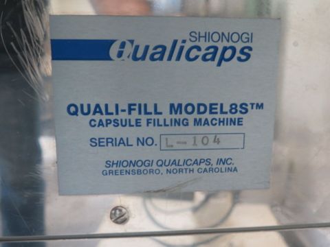 Shionogi Qualicaps Capsule Filler. Model: 8S, Serial: L-104, Semi-Automatic Capsule Filler. Comes with 1 set of change parts (size 0). As shown in photos. (Located Carson, CA)