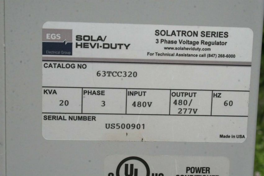 EGS Solatron Series Transformer, Catalog 63TCC320, ,S/N US500901, KVA 20, 3 Phase, 480 V Input, 480/277 V Output, Bottom Mounting (Loading/Handling Fee $150) (Located Apollo, PA)