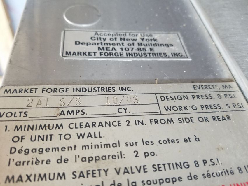 Market Forge Gas Steam Oven, Model 2A1, S/N 216508 (Rigging, Loading & Site Management Fee $50.00 USD) (Located Fort Worth, TX)