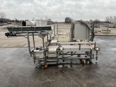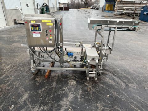 Scale Box Check Weightier and Packaging Conveyor, S/N 202763 with 1/2 hp Motor, 230 V, 1725 RPM, 3 Phase; Allen Bradley PLC Controls, 6-Adjustable Lockable Casters, Numerous Box Proximity Sensors, Box Infeed Guides, Stainless Frame, Product Blue Conveyor Aprox. 47-1/2" L x 12" W; Box Infeed Conveyor Aprox. 73-1/2" L x 12" W, Overall Dimensions Aprox. 10' L x 5' W x 52" H (Working Condition as of March 2022) (Unit #2231) (Prep Fee $150) (Located Pulaski, WI)