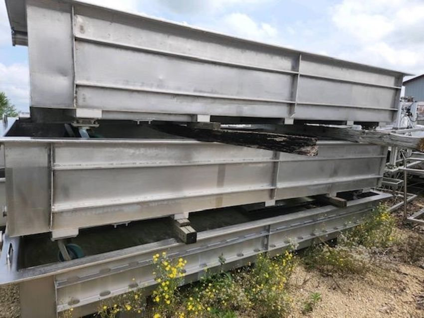 S/S Horizontal Drain Tank - Aprox. 56" W x 18" Deep x 160" L with 5" Tri-Clamp Infeed with 3-1/2" Tri-Clamp Outlet,, Inserts with Aprox. 1/4" Dia. Drain Hole, Very Heavy Duty S/S, Portable on Casters - Tank Last Used in the Dairy Industry) (NOTE: TANK WILL NEED TO SHIP VIA FLATBED DUE TO THE LENGTH -- PLEASE CONTACT FOR SHIPPING RATES) (LOADING FEE $200 (Located Hortonville, WI)