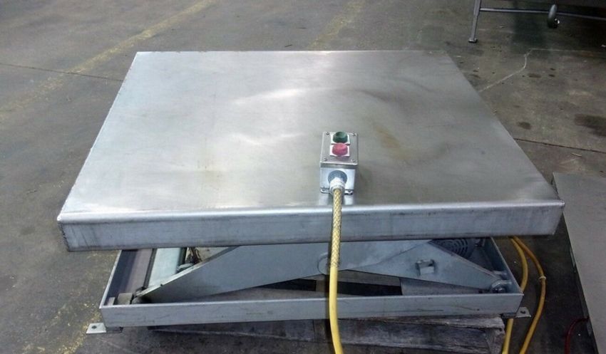 Apache S/S 4,000 lb. Pallet Lift Table, Model EZ4000, Platform Measures 40" W x 45" L, 110 V with Controls, Fully Extended Height 36", All S/S Used in Food Plant -- Have Video of Unit Under Power Upon Requiest, Will Crate for $300 to Ship Common Carrier (Located Hortonville, WI)