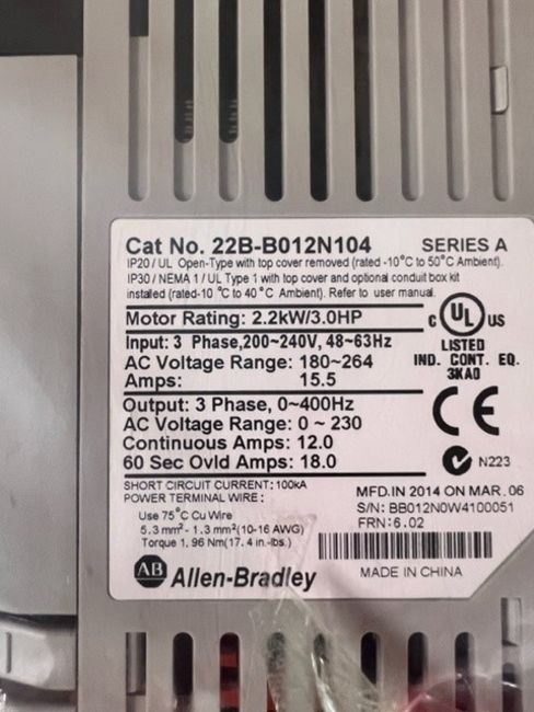 Allen Bradley 2.2 kW / 3 hp PowerFlex 40 Drive, Cat #22B-B012N104, Series A, 200 - 240 Volt, 3 Phase, New Sealed in Bag (Load Fee $50) (Located Harrodsburg, KY)