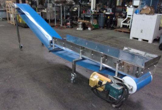 Econo Chesse Corp. 16" W x 189" L S/S Sanitary Incline Blue Belt Conveyor, S/N SS 102612 with 16" Wide Sanitary Solid Blue Belting, First Section of Conveyor Measures 90" Before Incline Section, 8" Side Rails Run the Entire First Section on the Conveyor, Incline Troughing Section of Conveyor Measures 96", Infeed Height is 19", Discharge Height is 48", Height could be raised with Adjustable Legs, Overall Dimensions are 189" L x 45" W x 55" H, Baldor 2 hp Drive, 3/60/30/460 V, 1755 RPM, 1.5 Second Per Foot Speed, Video of System Under Power Upon Reuest, System should Ship Via Regular Flatbed, Could Crate for $600 just not sure if there is a common carrier that will take a system this long. (Crating and Loading Fee $750) (Located Hortonville, WI)