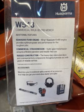 HUSQVARNA COMMERCIAL WALK-BEHIND MOWER, MODEL W548 (SEE TAG IN PHOTOS FOR MORE INFORMATION) (ALL PURCHASES MUST BE PAID FOR AND REMOVED BY 5/4/22) (ALL ITEMS MUST BE REMOVED BY THE PURCHASERS ON OR BEFORE 4:00 PM MAY 4TH, 2022. ANY ITEMS THAT REMAIN ONSITE AFTER 4:00 PM MAY 4TH, 2022 WILL BE ABANDONED NO REFUNDS WILL BE MADE TO THE PURCHASERS)