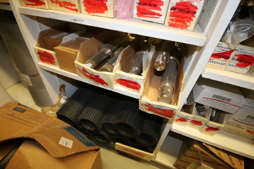 Row of Spare Parts, Includes Assorted Urschel Shredder Parts--NEW in Box, Assorted Bearings--NEW in Box, S/S Rods, Drives, & Other Present Parts In Photographs & Associated with Lot (NOTE: Does Not Include Boxes of Parts on Very Top Shelf) (HANDLING, LOADING, & SITE MANAGEMENT FEE: $500.00 USD--MUST PICK UP MAY 25TH) (LOCATED IN OTHELLO, WA) (LOCATED IN OTHELLO, WA)